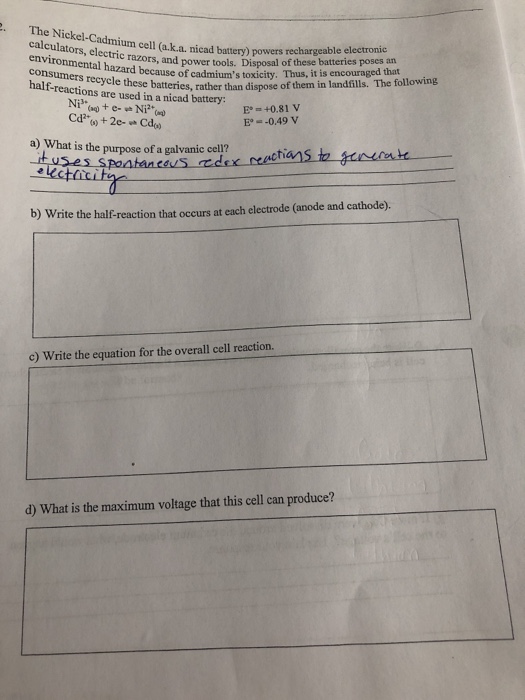 Nickel cadmium nicd is one of the most established amongst the various commercially available rechargeable battery systems. Nernst equation redox reactions and electrochemistry. 2015 ap chemistry free response 1d. 2015 ap chemistry free response 1d.